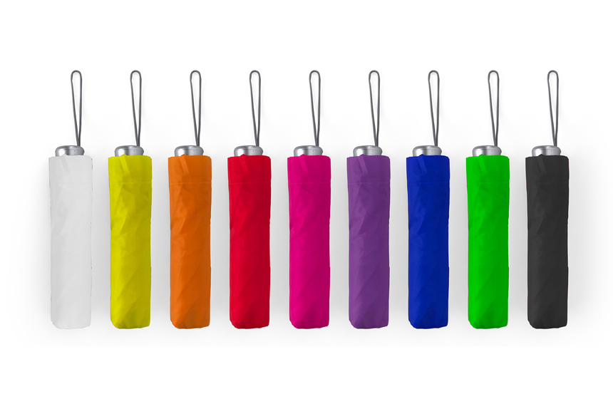 Сгъваем чадър със сребриста дръжка, тяло и връх.