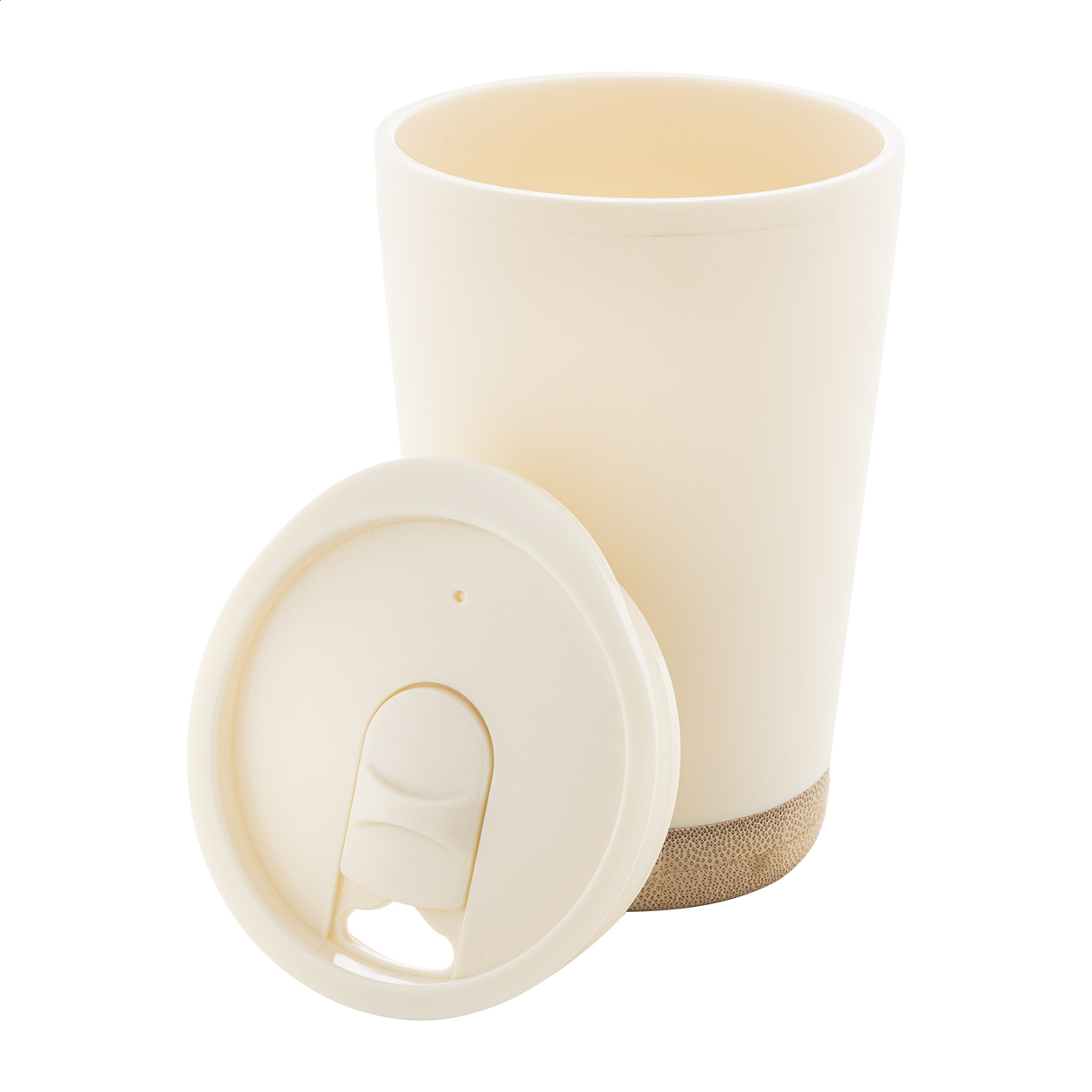 Термочаша с двойни стени, изолирана от PP пластмаса, с капак за пиене и бамбукова основа.