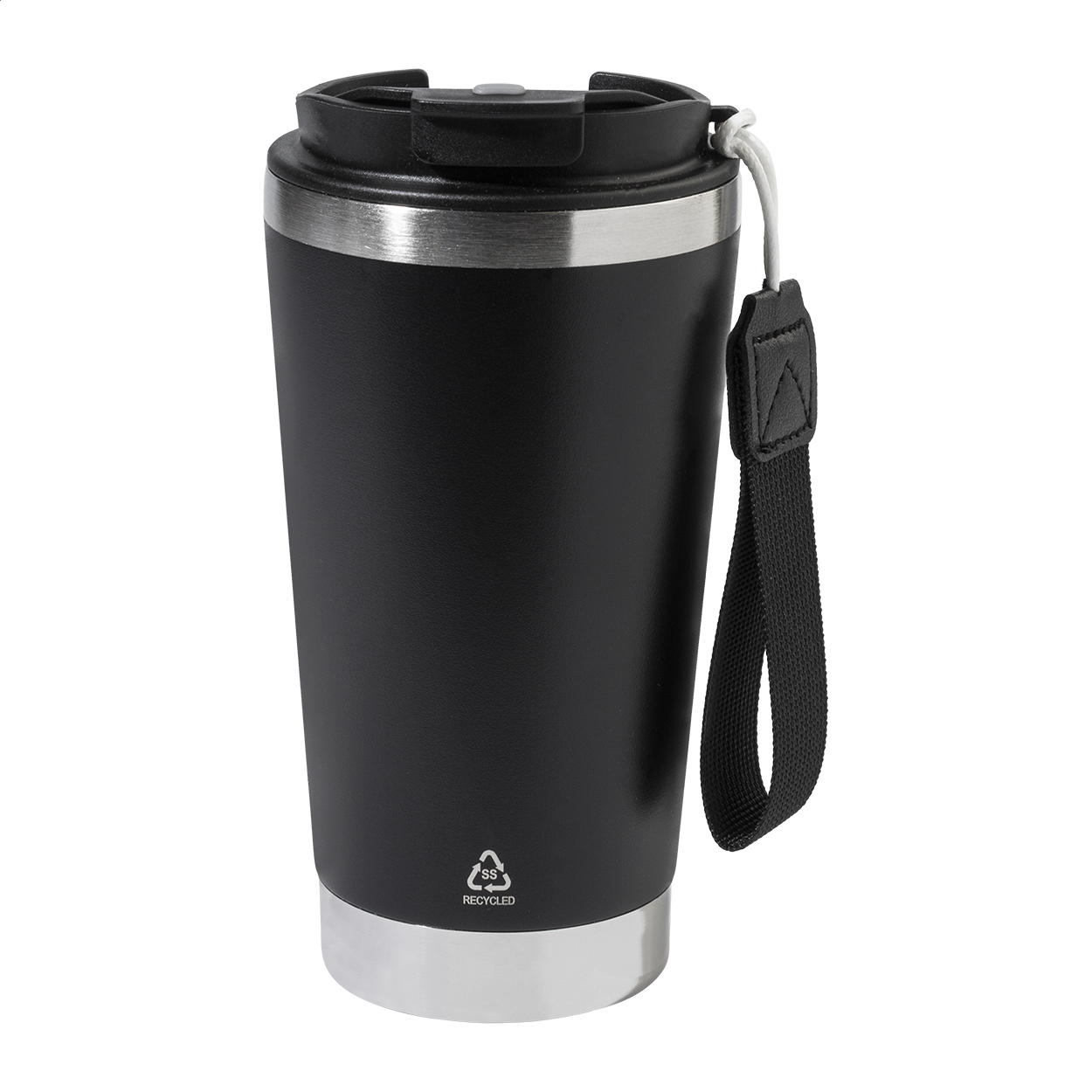 Двустенна термочаша от рециклирана неръждаема стомана с капак от полипропилен и подходяща цветна каишка за носене.