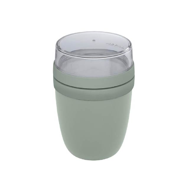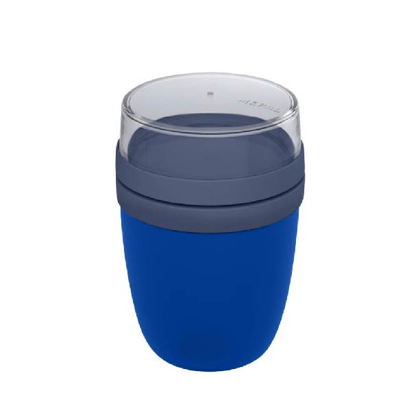 Кутия за храна с два отделни контейнера, които позволяват съставките да се съхраняват разделени. Всеки съд има собствен капак, за да остане храната чиста и свежа. Горен прозрачен контейнер: 200 мл (около 75 г твърда храна) • Долен контейнер: 500 мл. Изработена от издръжлива пластмаса, подходяща за фризер, микровълнова фурна (без капака) и съдомиялна машина. Горният прозрачен контейнер не трябва да се използва в микровълнова. Непропусклива, BPA free и с 2 години гаранция от Mepal.