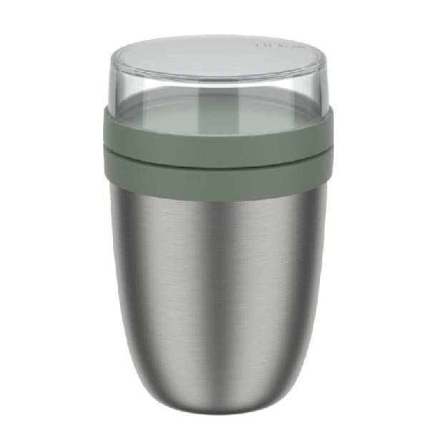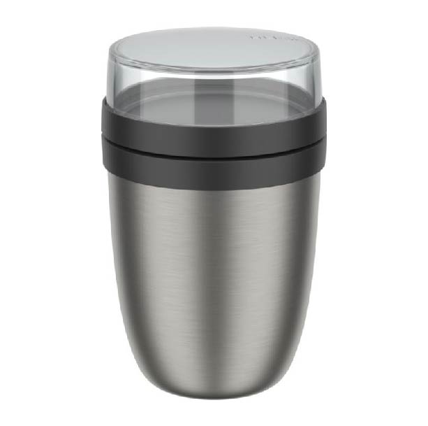 Термо кутия за храна с два отделни контейнера, които запазват съставките разделени. Всеки съд има самостоятелен капак, за да не се смесва храната. Поддържа храната топла 6–8 часа или студена до 12 часа. Горен контейнер: 200 мл • Долен контейнер: 500 мл. Изработена от издръждаема неръждаема стомана, като външната част остава суха и хладна на допир. Препоръчва се ръчно миене (пластмасовите части на капака могат да се мият в съдомиялна).