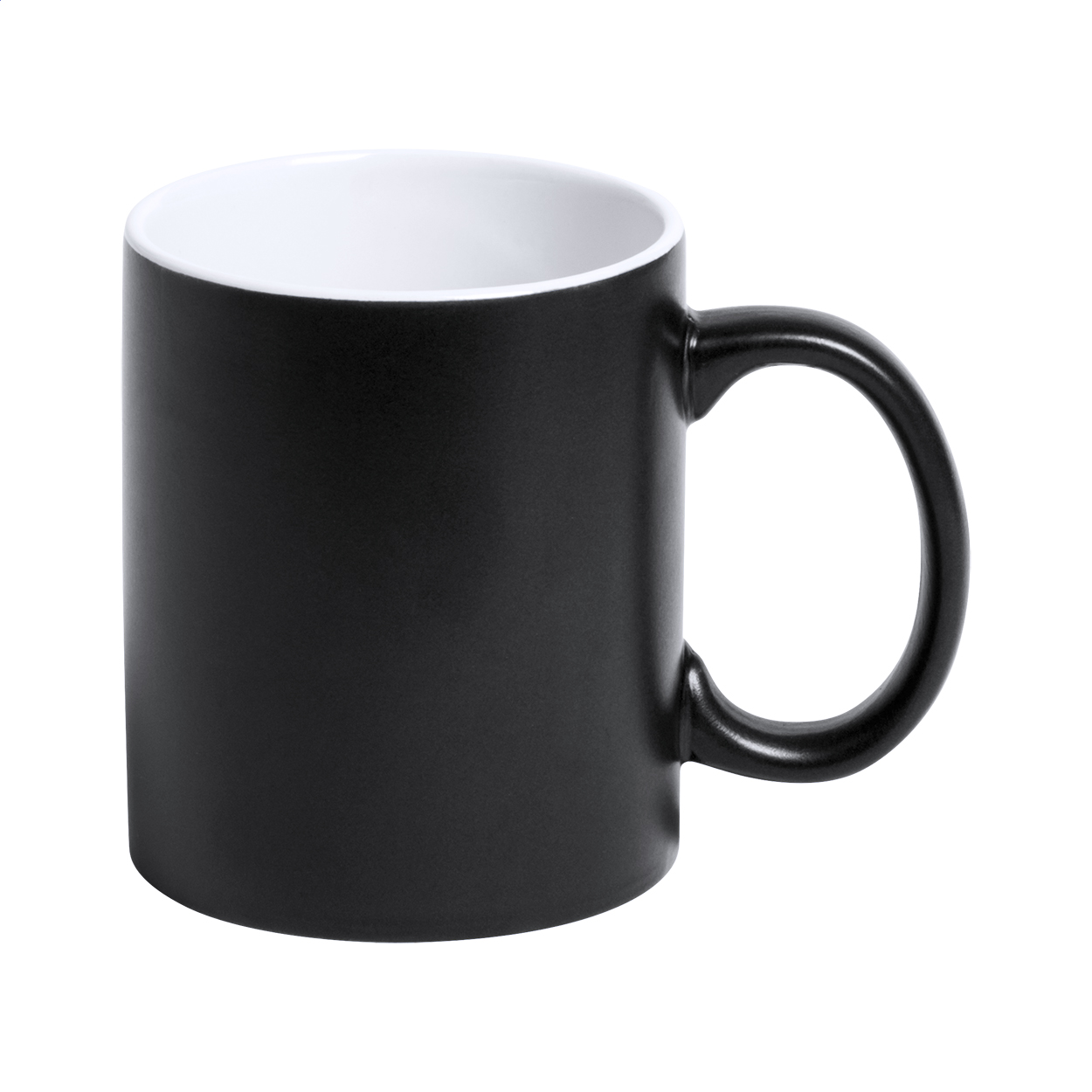 Цветна керамична чаша с бяла вътрешност. Със специално покритие за гравиране, гравираното лого съответства на цвета на вътрешността.